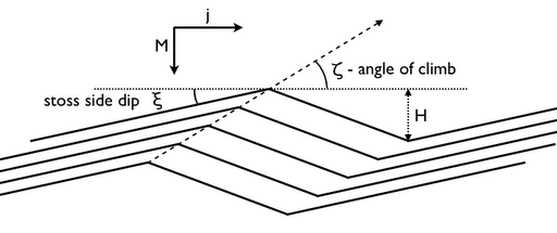 The most important relationship that Allen has derived links the angle of climb ζ (see the sketch below) to the rate of deposition M (measured in units of mass over unit time and area), the rate of bedload sediment transport j, and the ripple height H: