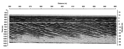 Derald G. Smith of the University of Calgary and Harry M. Jol of the University of Wisconsin – Eau Claire have looked at the internal structure of the Peyto Lake delta using a technology called ground-penetrating radar (GPR). The principles used in GPR data acquisition are similar to those of reflection seismology, but electromagnetic waves are used instead of acoustic energy, and reflections occur at boundaries with different dielectric constants rather than boundaries with different acoustic impedances. Compared to reflection seismic surveying (or digging a deep hole), the nice thing about GPR is that it is non-destructive: it can be used in situations where you want as little disturbance as possible. For example, it would be a bad idea to do seismic surveying of a leaking reservoir, but it is OK to look for the leaks using GPR. GPR is also used by archaeologists.