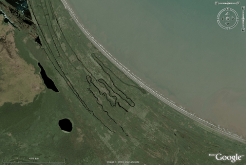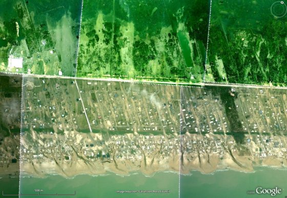 It is worth playing the before-and-after game with the aerial imagery shot by the NOAA’s Remote Sensing Division and made available in Google Earth. Here are a few screenshots from the Bolivar Peninsula.