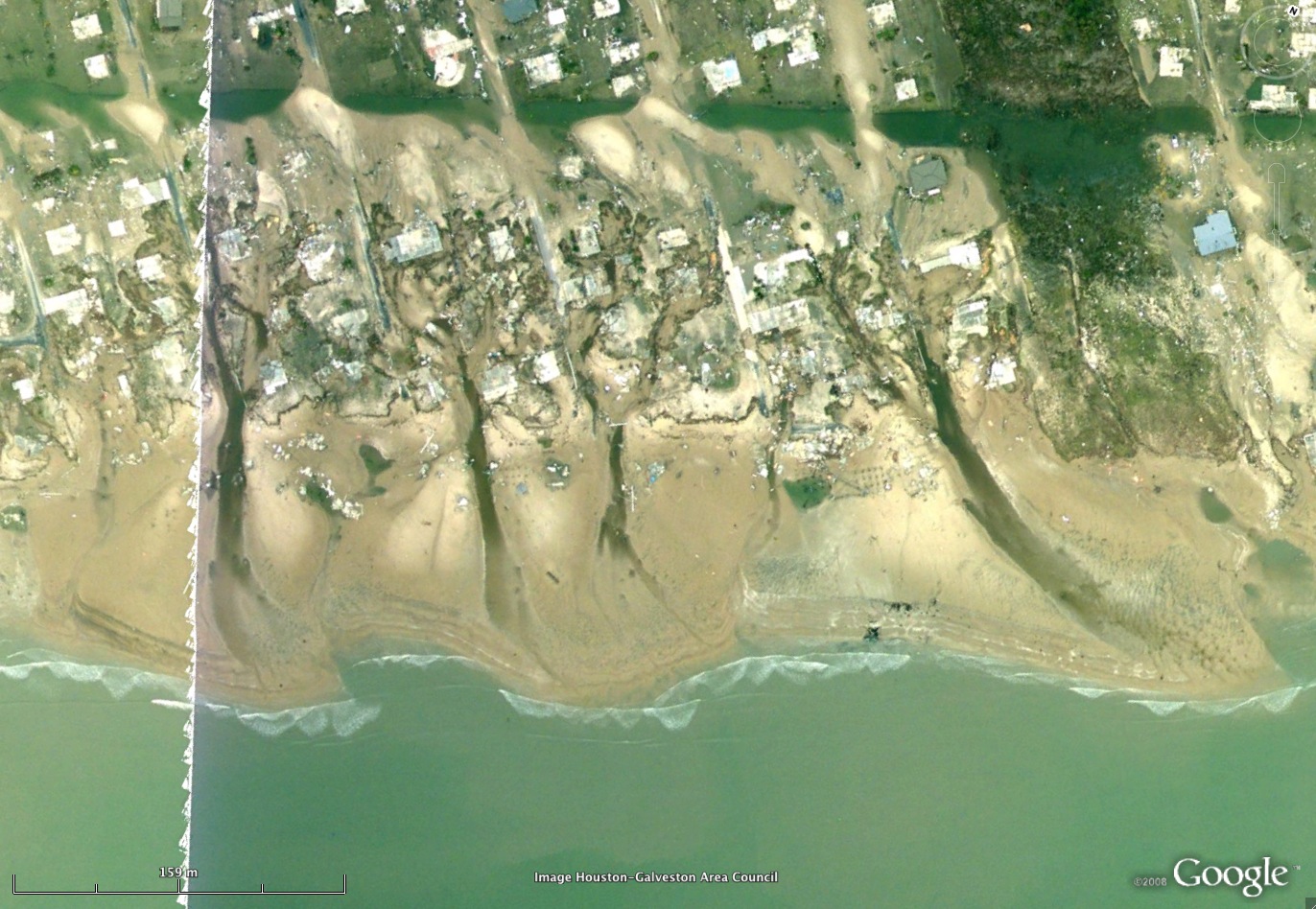 Hurricane Ike knocked me off the Internets for a while, but things are slowly getting back to normal. I haven’t been so close to – that is, in the middle of – a hurricane before; I have to say it was quite an adrenaline rush to hear and, to a lesser degree, watch the wind going by our windows with gusts of (probably) more than 100 miles per hour. In Houston, the damage was largely restricted to fallen trees and a few broken windows; fortunately not too exciting (see a few post-Ike photos over here). However, things are very different as you get close to the coast. Along the East Texas coast, the storm surge (unusually large for a category 2 hurricane) has shifted the coastline a few tens of meters landward, deposited lots of washover fans toward the lagoonal sides of the barrier beaches, and destroyed a large number of homes in the meantime.